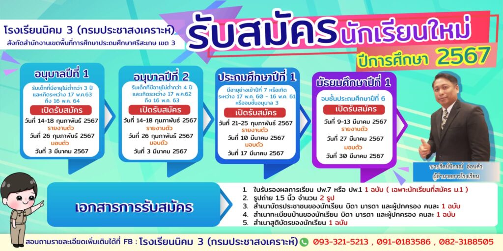 โรงเรียนนิคม 3 กรมประชาสงเคราะห์ รับสมัครนักเรียนใหม่ประจำปีการศึกษา 2567 สนใจสมัครด้วยตนเองได้ที่โรงเรียน หรือโทร 0933215213